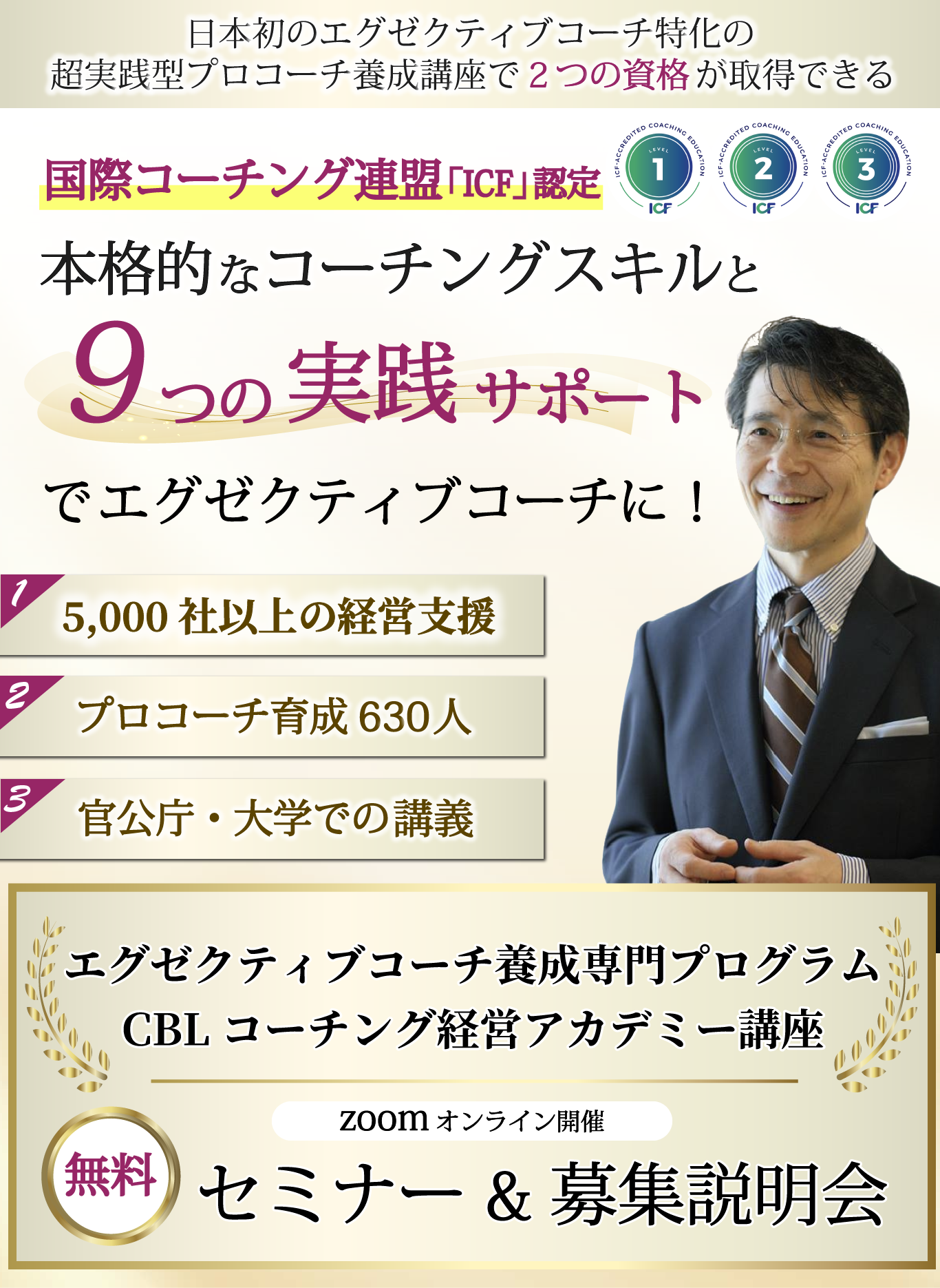 CBLコーチング経営アカデミーは日本初のエグゼクティブコーチを養成する講座です。講座では5,000社以上もの中小企業支援に携わってきた、経験とノウハウのすべてをお伝えし、国際コーチング連盟(ICF)認定(LEVEL2)の、本格的なコーチングプログラムと現場で活躍できる実践スキルを提供することで、最短距離でプロコーチを目指すカリキュラムをご用意しています。